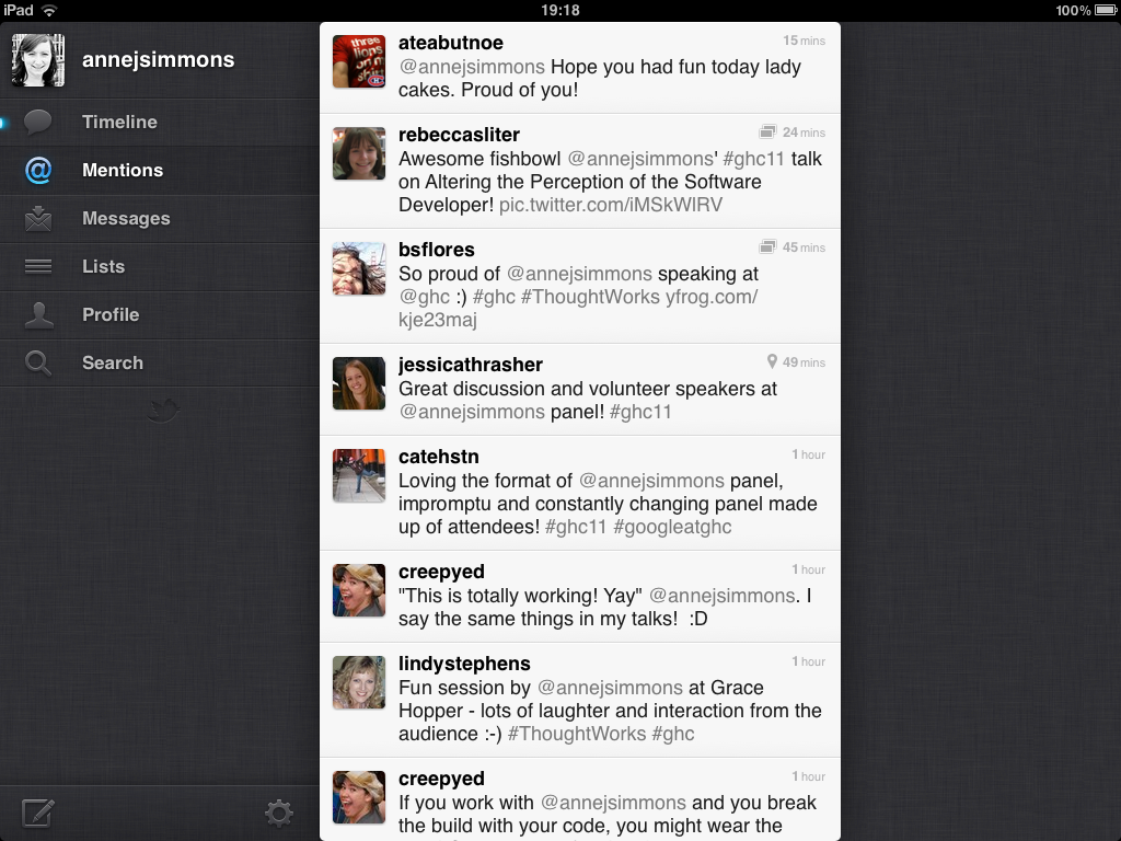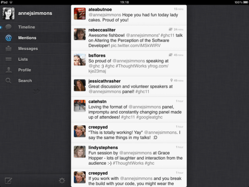 First one up was from the lady that I mentioned in my post https://annejsimmons.com/2011/11/16/being-a-speaker-at-the-grace-hopper-celebration-of-women-in-computing/. I literally hunted down this woman during the party on the last night to thank her for what she did for me without even realizing. Always let people know and thank them if they make an affect on you.