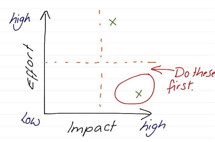 I found just keeping track of the behaviours I was seeing, coming up with things that I thought might help, and then reveiwing them daily with some of my colleagues really helped. It’s also worth thinking about whether or not a task is worth the effort that it requires. The image below is a Impact/Effort Analysis chart that you could use. Rate the potential exercise/piece of work on this scale and think about which order to then tackle things in.