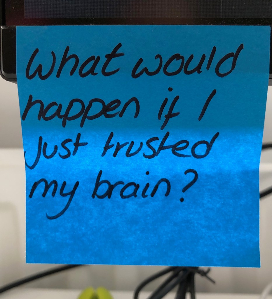- Don’t over-think it. I literally have have a post-it thats permanently stuck to my monitor that says “What would happen if I just trusted my brain?”. Well, I guess I’m still learning that lesson. I have found that if I try to over-analyse the strum or rhythm I’m trying to learn, by counting too much or worrying about getting it wrong, it really doesn’t help. Turns out when I just trust my musical ability and my brain to “just play”, it comes out just fine. It’s a good reminder on something that I’ve been working on for a lifetime.